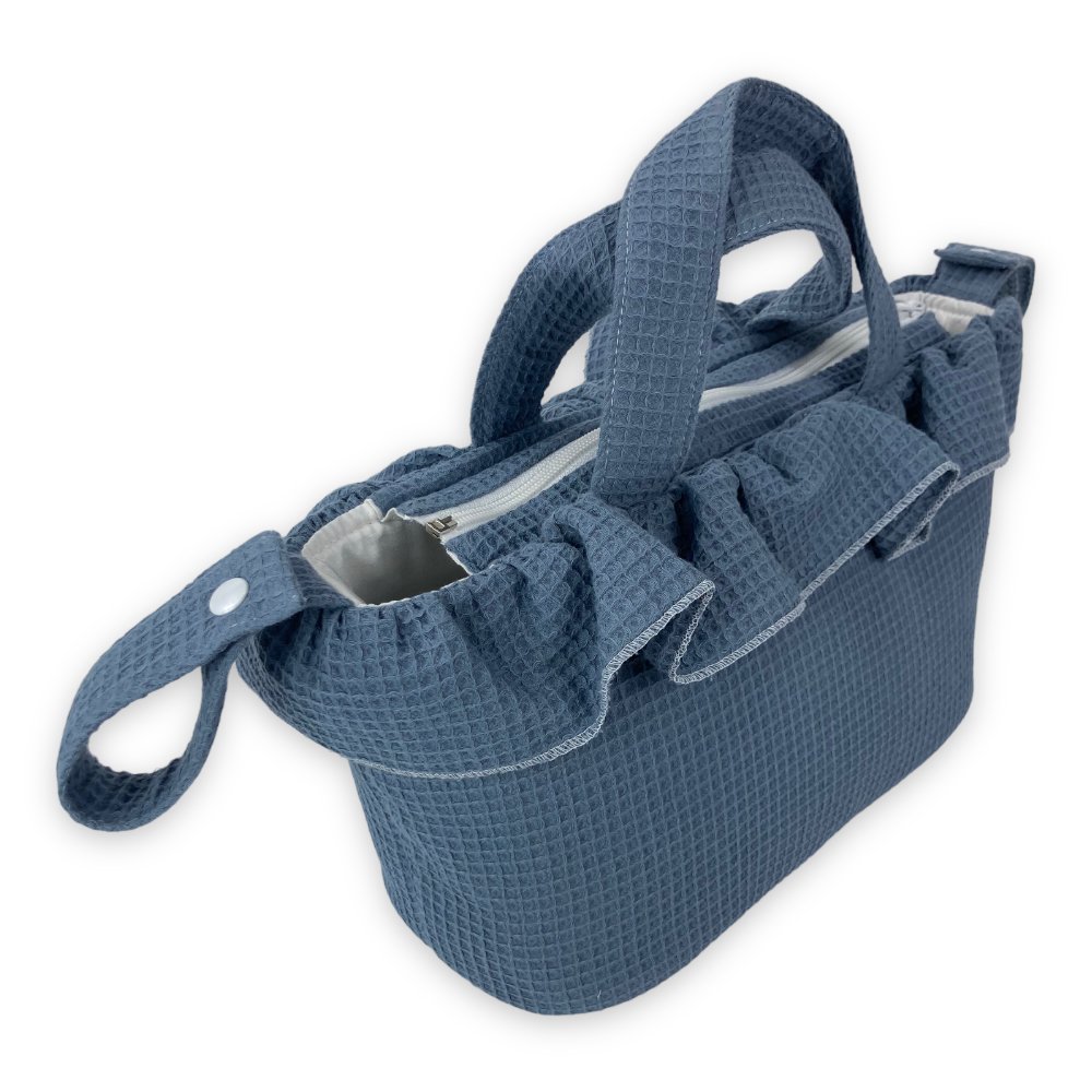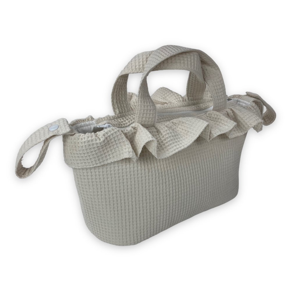 Bolso pequeño ideal para colgar del carrito. Incluye asa fija de mano y asas laterales con amarre de broches.