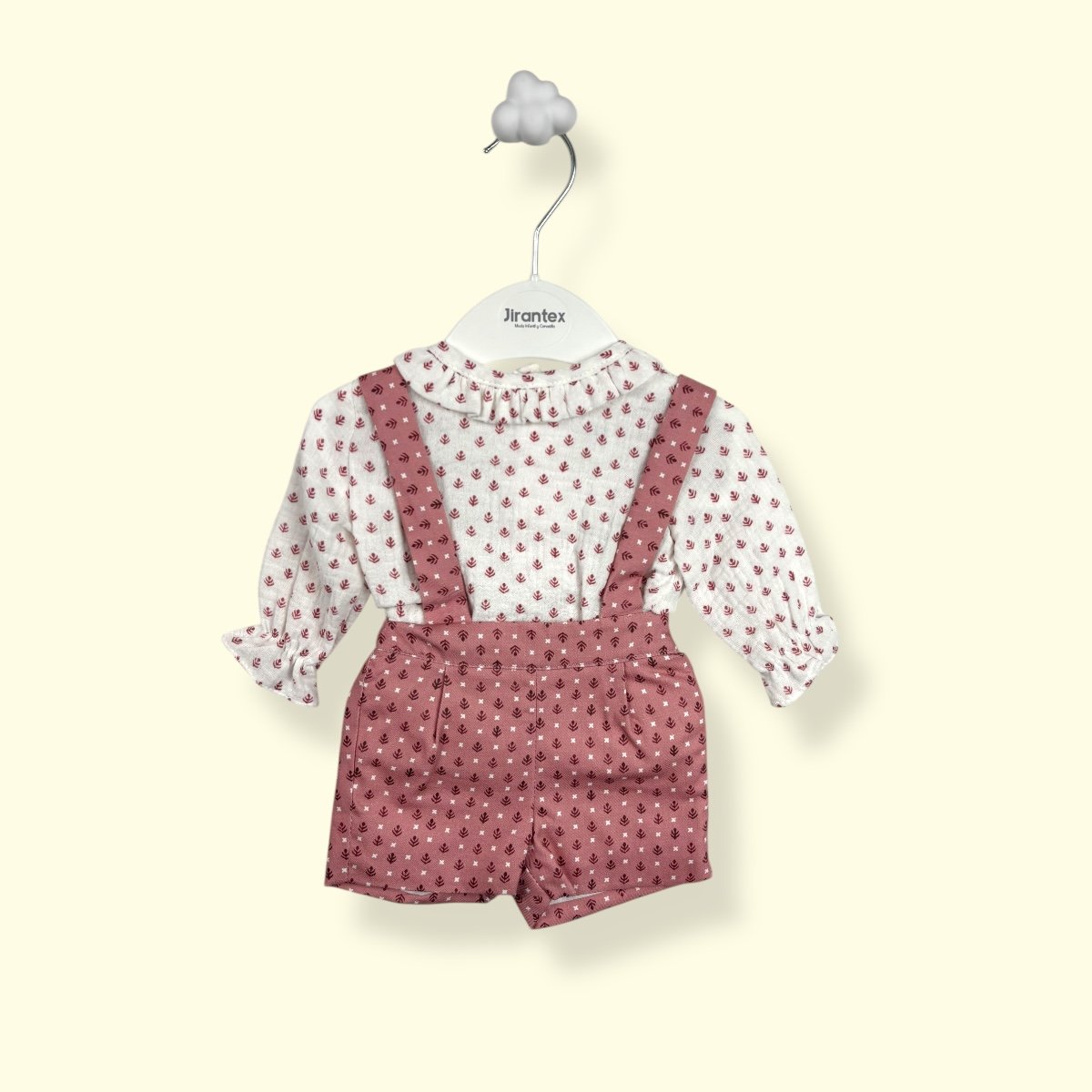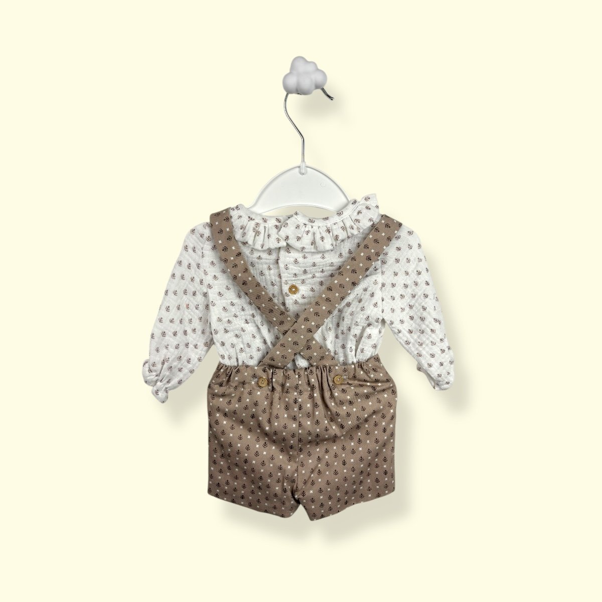 Con un diseño unisex de inspiración clásica, esta pieza destaca por la elegancia de su tejido y la comodidad de su patrón, permitiendo que el bebé se mueva con total libertad sin perder el estilo.